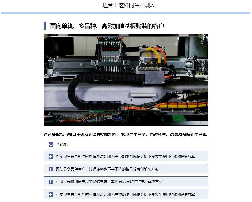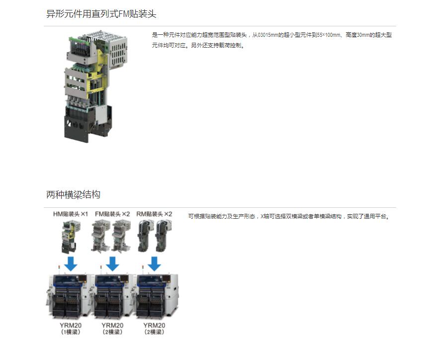 YRM20高效模塊貼片機 極 限改進“單一貼裝頭解決方案”,具有卓絕生產率和通用性的萬 能型貼片機1.融合Σ系列產品的技術,實現卓絕的生產率.2.采用“單一貼裝頭解決方案”,廣泛對應各種生產.3.標準配備可維持高品質貼裝的各項功能.4.通過運用豐富的功能群,實現高效生產.